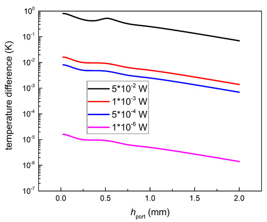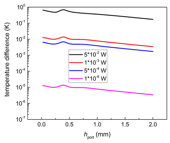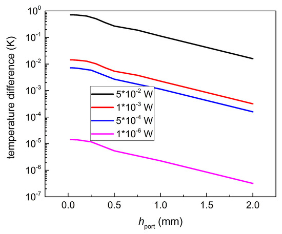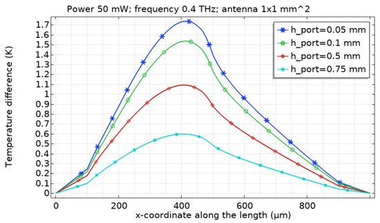 The transmission parameter decreases with the increase of the distance between wave excitation port and antenna. Hence, the resulting hot junction temperature must be inversely proportional to the . In Figure 8, Figure 9 and Figure 10, the dependence of temperature difference between hot junction and ambient temperature on is presented. Hot junction temperature was calculated as the average value within the hot contact length.