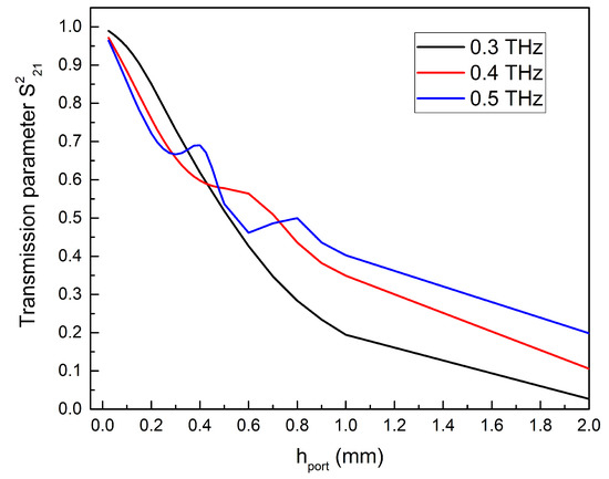 In Figure 7, the square of absolute value is presented. The results for different values were equal. In our case, distances between wave excitation port and antenna from several tens of microns to several millimetres are allowable. At the distance equal to 2 mm, the part of scattered radiation is from 0.81 to 0.97. The wave with the frequency of 0.3 THz scatters more intensively than with 0.4 and 0.5 THz. The lowest scattering rate can be seen at the frequency of 0.5 THz.
