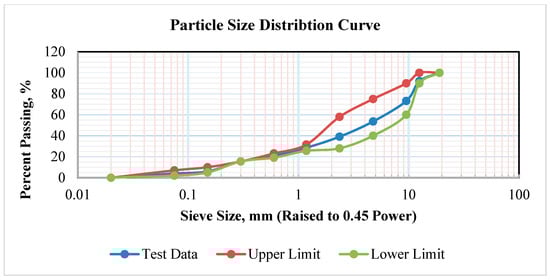 The aggregate used in this research was granite obtained from Deneba, about 350 km southwest of the city of Addis Ababa, Ethiopia. The selection of the gradation was done following the SuperPave® [] procedure with a nominal maximum aggregate size of 19 mm. SuperPave is a mix design procedure and binder specification developed by a strategic highway research program (SHRP). A SuperPave® gradation curve was selected for good particle interlocking, sufficient voids in mineral aggregate (VMA), and dense-graded HMA [,]. All properties of the aggregate were determined in accordance with American Society for Testing and Material (ASTM) or British Standard (BS) procedures, and the test results are presented in Table 1 and Figure 1.