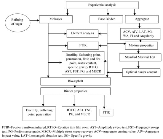 In the third phase, binder specification tests such a rotational thin film oven (RTFO) test, dynamic shear rheometer (DSR) test, frequency sweep test (FST), amplitude sweep test (AST), multiple stress creep recovery (MSCR) test, and PG determination test were carried out to evaluate the high, intermediate, and low-temperature rheological properties and performances of the BB and MMB’s. The entire sequence of the experimental program is presented in Figure 2.