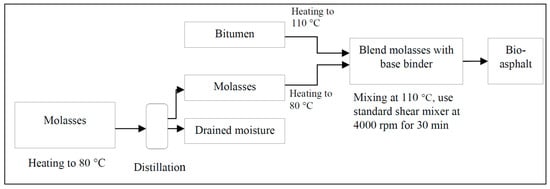 During the fractional distillation process, the molasses was heated to a temperature of slightly lower than 80 °C, and the resulting water content was 5.02%. The limiting 80 °C was selected because the molasses started to foam at that temperature. Then, BB was uniformly heated using a digital bitumen hot plate at a temperature of 110 °C until it turned into a liquid phase and immediately blended with the preheated molasses per the specified percentages (5%, 10%, 15%, and 20% of molasses). To ensure that the BB was uniformly heated, it was continuously stirred and a temperature measurement was taken using a calibrated thermometer at different locations of the BB. Each blend was mixed using a shear mixer at a speed of 4000 rpm for 30 min to get a homogeneously mixed MMB [,,,]. The steps followed in the preparation of the bio-asphalt binder are shown in Figure 3.
