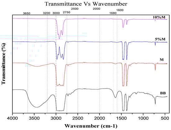 The FTIR test results of the BB, MMB5, and MMB10 are presented in Table 5.