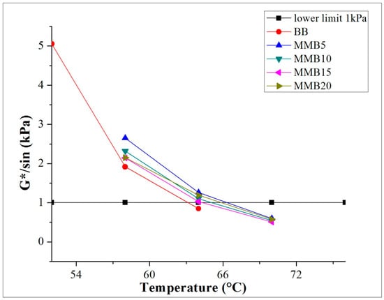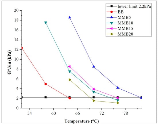 The rutting resistance parameter G*/Sin of the un-aged and RTFO-aged MMBs are shown in Table 8 and Table 9, respectively. The G*/Sin of the MMBs versus temperature effects were plotted, as shown in Figure 5 and Figure 6. The results were compared with the rheological parameter (G*/Sin) of the control PG [].