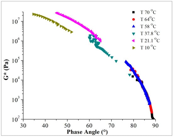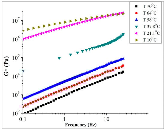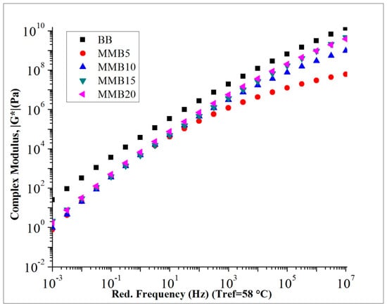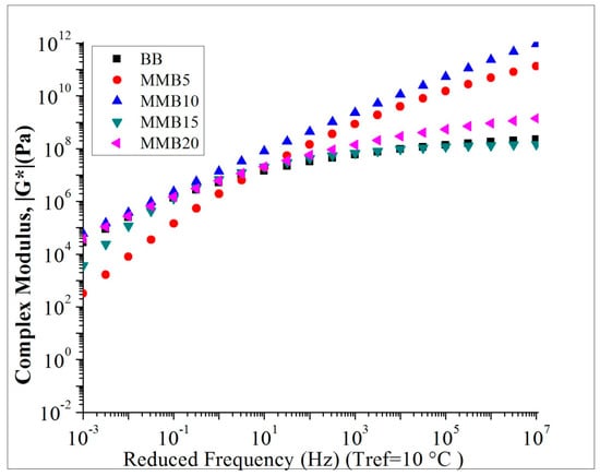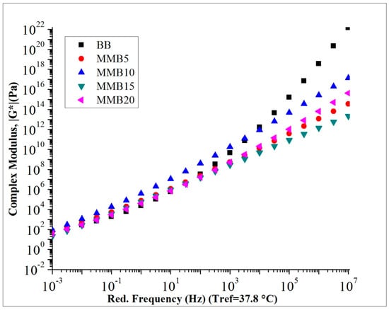 The master curve of the complex modulus of the BB and MMBs were constructed using the time-temperature equivalent principle [,,]. The reference temperatures were 58 °C (high), 37.8 °C (intermediate), and 10 °C (low). In this study, a sigmoidal function was used to fit and smoothen the test results at different temperatures and to construct the master curve [] of the complex modulus by means of Microsoft Excel solver. The principle is shown in Equation (3) [].