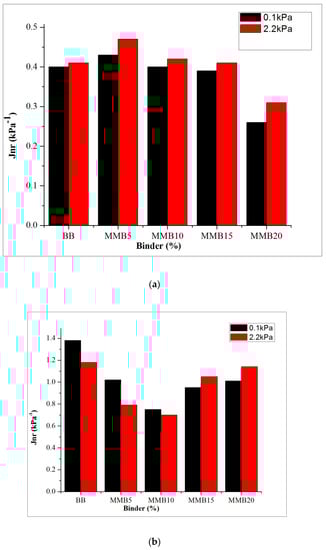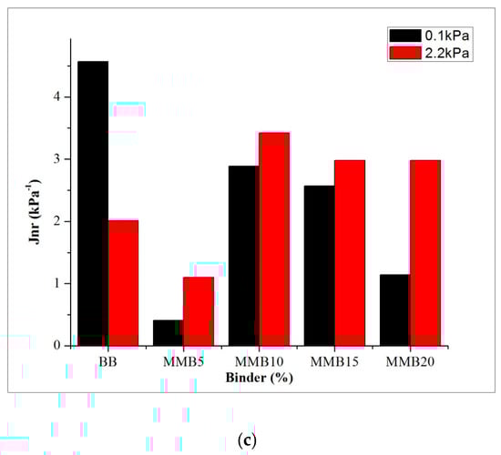 Bohlin Dynamic Shear Rheometer (DSR) instrument was used to perform a multiple stress creep recovery test for RTFO-conditioned BB and MMB’s in accordance with the AASHTO T-350 standard procedure []. The test was used to evaluate the non-recoverable creep compliance (Jnr) and the measure of the potential of a binder to undergo permanent deformation (rutting) under cyclic loading [,,]. During the test, the applied stress level at the outset was 0.1 kPa and, after 10 creep/recover cycles, was increased to 3.2 kPa. The Jnr was calculated as a residual strain in a specimen after creep/recovery cycles divided by the applied stress.