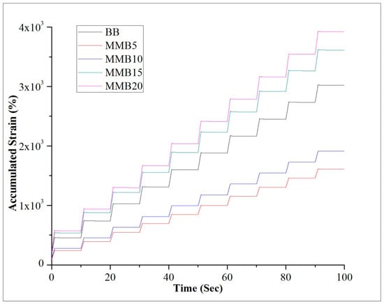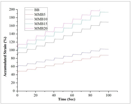 Figure 13 and Figure 14 show that the accumulated strain was influenced by the percentage of the molasses used. Smaller values of accumulated strain were obtained for MMB5, which is followed by BB, MMB10, MMB15, and MMB20 for a 3.2 kPa stress level and BB, MMB15, MMB20, and MMB10 for a 0.1 kPa stress level. From this, it can be concluded that MMB5 could better improve the resistance to rutting phenomena compared to the MMBs with higher molasses content.