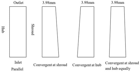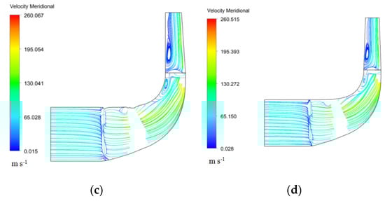 Radial velocity streamline distribution of the entire meridian at the design mass flow: (a) parallel; (b) convergence from shroud; (c) convergence from hub; (d) equal convergence from shroud and hub.
