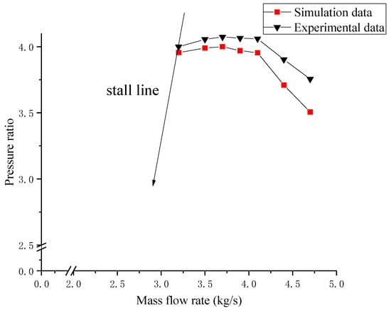 For the limitation of the experimental conditions, the numerical model in this paper was validated by comparing the result of simulation with the experimental data of Krain’s impeller from the opening literature [] in the authors’ previous paper []. Krain’s impeller is a transonic compressor impeller designed by Krain et al. []. The comparison of pressure ratio between experimental and numerical simulation is presented in Figure 3. From Figure 3, the result of simulation is generally less than the experimental data, and the deviation between two curves caused by the contradiction between the number of grids and the calculation cost or the description of the real flow by the numerical algorithm is within 6%. So it can be concluded that the numerical scheme in this paper can predict the compressor performance accurately.