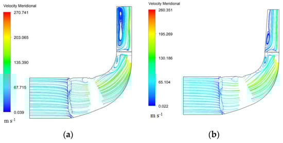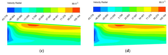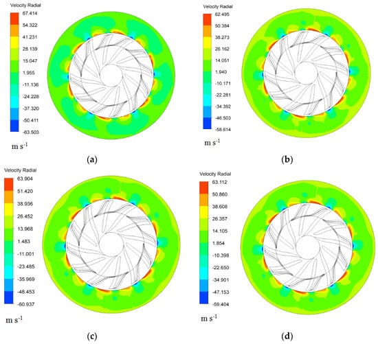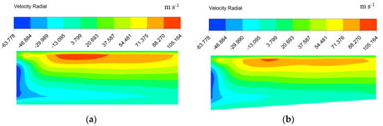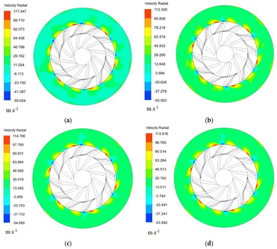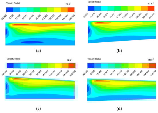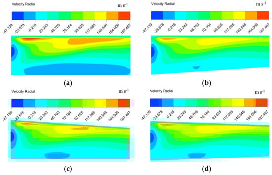 Through the analysis of Figure 4, the shape of the vaneless diffuser has a great influence on the flow stability under the design conditions of the centrifugal compressor, especially the internal flow field of the vaneless diffuser. In order to analyze the internal flow characteristics of the diffuser in detail, the method of analyzing the radial velocity distribution in the meridian plane is adopted.