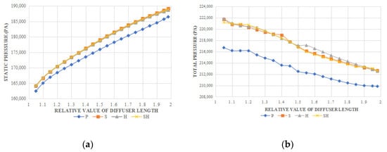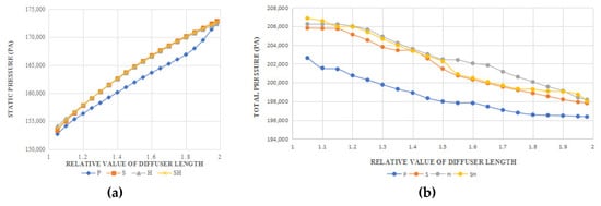 Near the entrance of the vaneless diffusers in Figure 11, the difference between the static pressure values of the three convergent vaneless diffusers and the parallel wall vaneless diffuser has no significant difference. And in Figure 11, the definition of symbols below picture can be find in Appendix A. The static pressure value always shows a convergent type with the extension of the diffuser length. The state pressure of diffusers of reduced width is higher than that of the parallel wall diffuser and the static pressure difference is gradually increased. The variation of static pressure of the three convergent vaneless diffusers is formed a stable law after 15% of the vaneless diffuser length: the highest static pressure can be realized by converging diffuser wall from the shroud side, the lowest one can be realized by converging from the hub side.