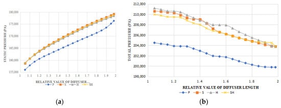 Mean static pressure and total pressure distribution along the diffuser length direction at 1.125 relative mass flow: (a) static pressure distribution; (b) total pressure distribution.
