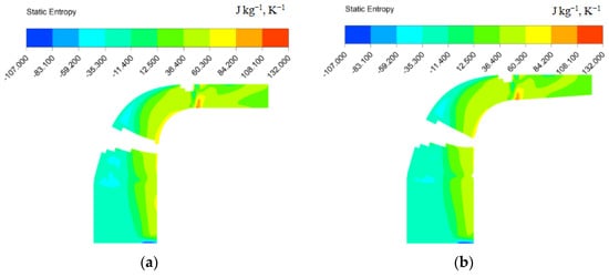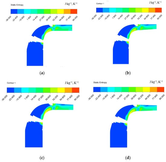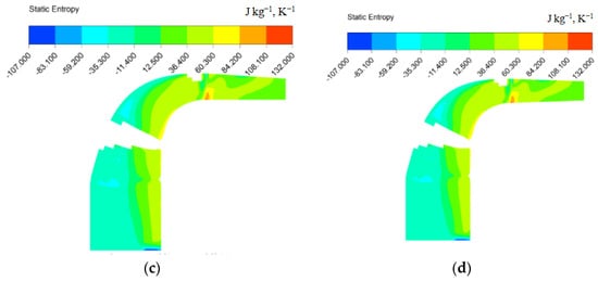 The meridional surface static entropy distribution under three operation conditions is demonstrated in Figure 14, Figure 15 and Figure 16. The same scale is used in these contours. For the static entropy distribution on the meridional surface of the diffusers at 1.125 relative mass flow in Figure 14, there is an increased static entropy area at the exit of the parallel wall vaneless diffuser compared with the three diffusers with convergent width, and the area where the entropy value near the hub side develops from the lowest range to a higher range is wider. The energy loss in the span direction is also greater near the shroud side. Inside the impeller, there is no obvious difference in the distribution of the static entropy of the four diffusers. Under this condition, the effect of shape of vaneless diffuser on the internal energy loss of the impeller is relatively small, which is similar to the above conclusion. There is no obvious change in the form of the diffuser. At the connection between the vaneless diffuser and the impeller, the increase of entropy area with the parallel wall vaneless diffuser is more obvious. Moreover, the effect of the three convergent forms of vaneless diffuser on the reduction of energy loss in this operating condition is not much different.