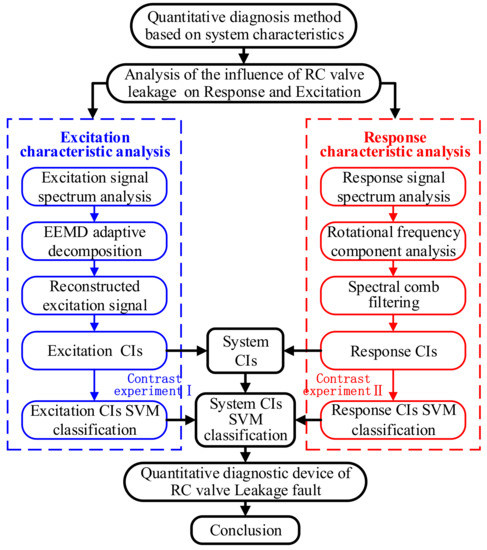The rest of this paper is organized, as follows. Section 2 presents a framework of the proposed method, established the RC motor current model, and analyzed the influence mechanism of valve leakage on RC vibration. Section 3 introduces the experimental test-rig and conditions of data collection. The failure characteristics of excitation signal and response signal are analyzed, and the CIs are extracted in Section 4. The pattern recognition and quantitative diagnosis of RC valve leakage fault are performed in Section 5. Finally, Section 6 addresses the conclusions of this paper.