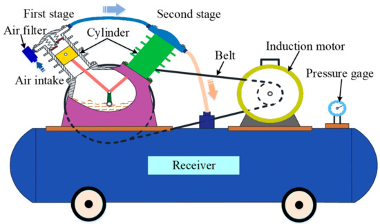 Based on the construction and working process, a two-stage and single acting RC can be represented, as in Figure 2. It consists of four parts: an induction motor, a reciprocating compressing unit, a compressed air storage tank, and safe-assistant device.