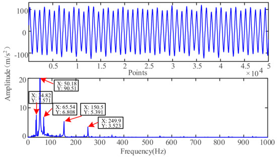 Figure 8 shows the frequency-domain waveform of each group of the current signals. This figure shows that the current signal contains the motor power supply component (50.18 Hz) with the largest energy, the side frequency component, and a large number of higher harmonics.