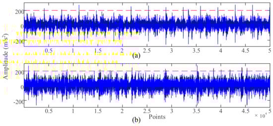The number of impacts whose amplitude exceeds 200 in Figure 5a is significantly greater than that in Figure 5b, and the periodicity of the signal waveform in Figure 5a is more obvious than that in Figure 5b, as shown in Figure 5. The vibration signal not only contains a wealth of fault features, but also maintains a system transfer characteristic relationship with the current signal. Therefore, this paper adopts vibration signal as a response signal to analyze the response characteristics of RC valve fault.