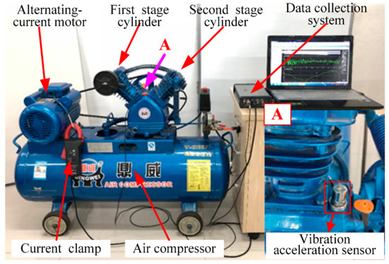 The test-rig that was designed in this paper consisted of a two-stage single-acting reciprocating air compressor, sensors, and data acquisition system, as shown in Figure 6. Among them, the acceleration vibration sensor has a sensitivity of 50 , a frequency response of , and it is mounted on the root of piston cylinder body, as shown in the A view of Figure 6. The current clamp has an accuracy of and a conversion ratio of , which is clamped to the power supply wire of the AC motor. The experimental speed of the air compressor crankshaft is 900 r/min, and the maximum pressure that the RC can provide is 1.6 MPa.