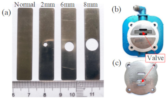 Disassemble the compressor cylinder to take out the faulty valve, as shown in Figure 17b. An approximately circular hole of about 5 mm was generated in the middle of the valve and a certain bending occurred. This bending creates a gap between the valve and the valve body, which can cause gas leakage. Therefore, the above diagnosis results were close to the actual leakage level of the valve, which further proves the quantitative diagnosis ability for the RC valve leakage fault of the method that is proposed in this paper.