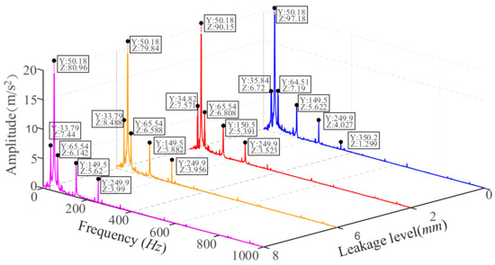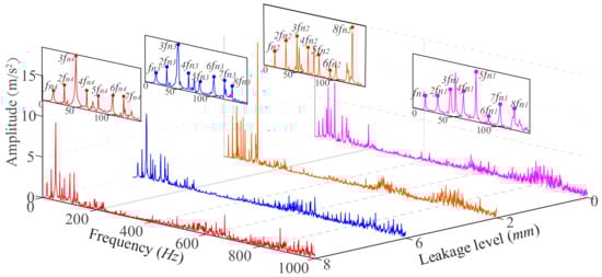 Figure 11 shows the frequency-domain waveforms of each group of vibration signals. Among them, , , , and , respectively, represent the rotation frequency of RC under the conditions of normal, 2 mm leakage, 6 mm leakage, and 8 mm leakage of the valve.