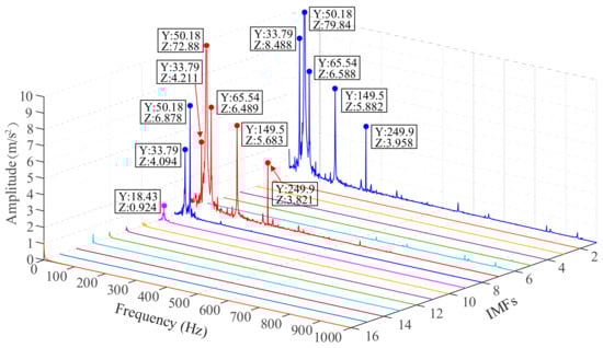 The side frequency component of the current signal is the primary carrier for the failure characteristics of the RC valve. The power supply component and its higher harmonic will weaken the features of the side frequency component, which should be eliminated as much as possible. In this paper, EEMD is used to decompose the excitation signal to extract the side frequency component and other related components. After EEMD decomposition, 16 IMFs were obtained from each group of data and the spectrum of 16 IMFs was analyzed. The IMFs spectrum is shown in Figure 9, taking 6 mm leakage fault as an example.