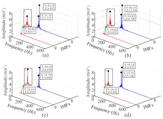 Therefore, IMF8 and IMF9 of each group of IMFs were extracted for energy spectrum analysis, and the analysis results are shown in Figure 10. This figure shows that the IMF8 and IMF9 of each set of data all contain single side frequency components and rotation frequency related components. Moreover, IMF8 and IMF9 have no obvious harmonic components. Hence, the IMF8 and IMF9 of the current signal was used to reconstruct the excitation signal.