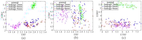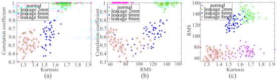 None of the three excitation CIs can completely classify the valve features of the four statuses, as shown in Figure 12. In Figure 12a, the normal valve is not separated from the 2 mm leakage valve. There are some feature points crossing each other between 6 mm and 8 mm leakage valve, and the distribution of feature points is relatively scattered, which is not conducive to feature classification, as in Figure 12b. Although, the four valve faults are not completely separated, and there are individual points that cross together in Figure 12c. However, the distribution of characteristic points is relatively concentrated, which is beneficial to classification.