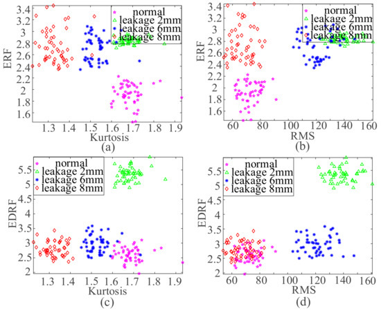It can be seen from Figure 14 that the classification effect of using K and ERF, EDRF on fault modes is better than that of using RMS and ERF, EDRF. In Figure 14b,d, RMS and ERF, EDRF do not completely separate the different RC fault modes. Although the four types of feature points in Figure 14a,c are separated, the data points in Figure 14c are more concentrated. Therefore, K and EDRF have a better classification effect on faults.