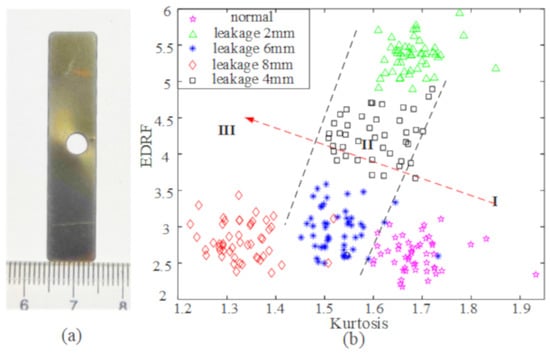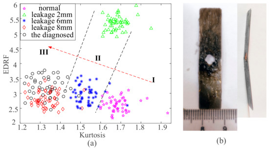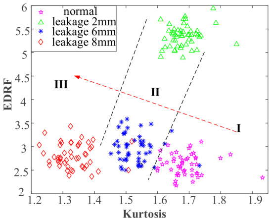 In Figure 15, the classification effect diagram that is based on the system CIs K and EDRF is divided into three regions. Where, region I indicates a minor leakage failure (), region II represents a moderate leakage failure (), and region III indicates a severe leakage failure (). Combined with the feature point set of the four status as a reference template for quantitative diagnosis, a “three-region and four-point set” quantitative diagnoser for RC valve leakage is constructed.