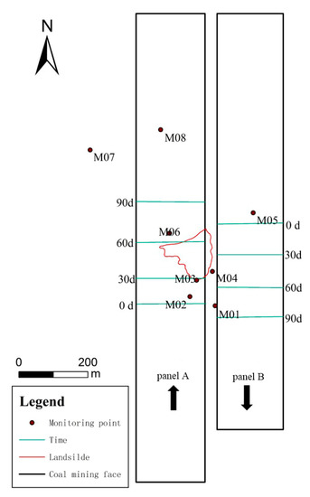 (1) Due to coal mining in panels A and B, the movement trend of monitoring points M01–M04 was the same, but the magnitude of movement was different. The largest movement in the X direction was observed at M02 and M03, while the largest movement in the Y direction was observed at M04. As shown in Figure 1, the X direction of M02 and M03 and the Y direction of M04 were close to the downhill direction of the slope body, and the topographic slope had a large influence on the displacement; therefore, they had large moving values.
