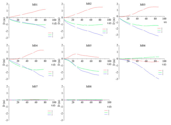 (2) In contrast, M06 was located at ground level in the center of panel A. The horizontal movement in the Y-direction is very small and the movement in the X-direction was the opposite of the other monitoring points.
