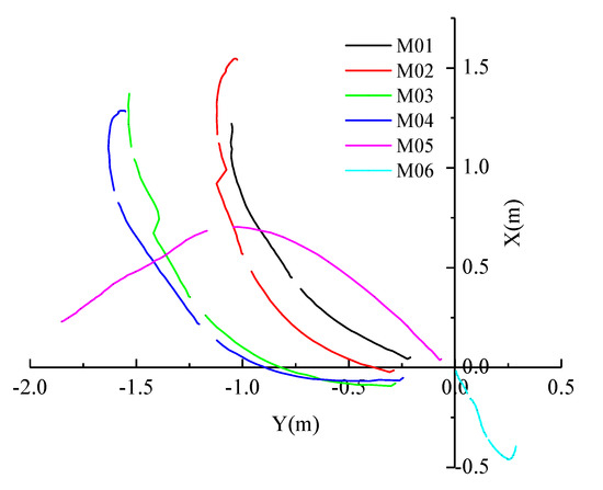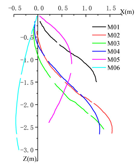 (2) The horizontal movements in the X direction at M02, M03, and M04 were larger than those at other monitoring points, and were mainly affected by the downhill direction of the slope body. When the working face passed over these points it was affected by the topography, with little backward movement in the X direction (i.e., moving to the initial position). The backward movement in the X direction was largest at M05, with M06 also showing a trend of backward movement.