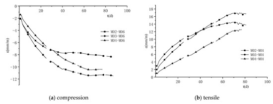 Figure 10 shows that with the continuous advancement of the working face, the extrusion deformation at M06 and (M02, M03, and M04) increased. The deformation rate of the shape of the ground surface decreased over time, with the maximum compression being more than 11 mm/m. The largest deformation occurred at M03–M06, which highlights the effect of the ground slope on the slope body. Figure 10b shows that the tensile strength of M01 and (M02, M03, and M04) increased continuously, the deformation rate decreased slowly, and the maximum deformation reached 17 mm/m. The rock formations in this area generally consist of hard rock types. When the deformation value reached 2–3 mm/m, cracks, extrusion uplift, and caving occurred on the ground. Although mining has caused large-scale deformation of the ground surface in this area, the deformation speed gradually decreased during this study. After 70 days of monitoring, the deformation rate decreased and the associated risk of high-steep slope failure decreased. The area with an increasing deformation velocity was always located in the influence zone ahead of the working face (i.e., surface non-uniform deformation was mainly concentrated in this area). However, the deformation rate and the non-uniform deformation in the influence zone behind the working face after mining began to decrease, and disturbance of the slope body decreased.
