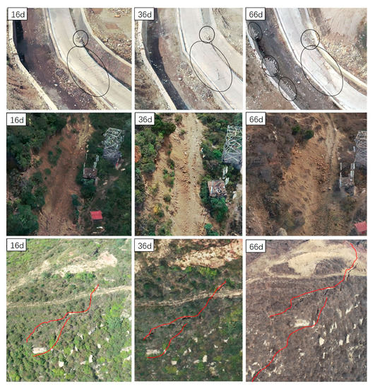 In the area affected by mining, it was found that the number and length of surface cracks increased with the advance of the working face. Combined with the UAV time series image and the corresponding deformation degree, it was found that when ε > 4 mm/m (i.e., 16 d) a surface uplift deformation was produced, and when ε > 7 mm/m (after 36 d) a small caving was produced. As shown in Figure 13, when the deformation reached a maximum and remained constant (at the inflection point of the horizontal deformation curve), three cavings were produced near the foot of the slope. When the deformation decreased, the rate of field failure decreased.