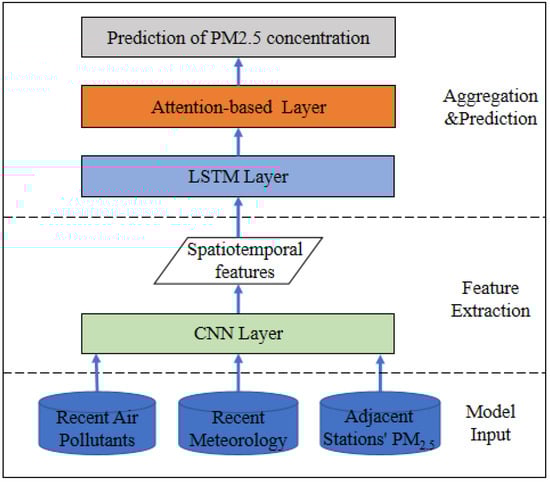 As shown in Figure 1, the framework of our approach consists of three major parts: model input, feature extraction, and aggregation and prediction. Since PM2.5 concentration is extremely affected by spatiotemporal features, recent air pollutant concentration, meteorological data, and the PM2.5 concentrations of all adjacent stations are stacked to construct an input tensor for the one-dimensional CNN layer. In this way, the spatiotemporal features are extracted by the CNN layer. Then, the spatiotemporal correlation is learned by the LSTM layer. Because of the different effects of past states of different times on the PM2.5 concentration, the attention-based layer can weigh the feature states at past different hours. Finally, the aggregation and prediction of the proposed model is achieved.