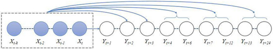 How the model predicts the PM2.5 concentrations of the next 24 h is described in Figure 2. As shown in Figure 2, Xt represents the input data of the model at time t (e.g., air quality data, meteorological data in Figure 1), Yt+1 represents the predicted value of the PM2.5 concentration at time t + 1, and k represents the time lag. We group the air quality data within a particular time lag to formulate different inputs (shown in the broken rectangle) for multiscale predictors, which are used to train separate models corresponding to different time intervals. The time lag of the model input indicates how many hours the input data are in the past. Each blue arrow shown in Figure 2 represents a different predictor. Afterward, a separate model is trained for each hour over the next 3 h. With respect to the next 7–24 h, it is divided into three time intervals, i.e., 4–6, 7–12, and 13–24 h, where separate models are trained to predict the mean PM2.5 concentration during each time interval.