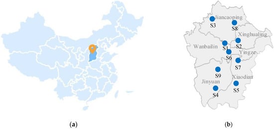 (a) The location map of Taiyuan City; (b) distribution of air quality monitoring stations in Taiyuan City.