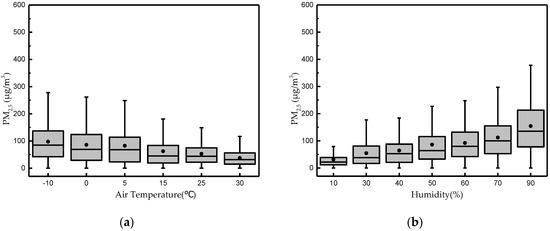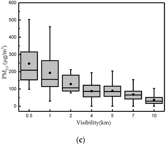 Box charts of meteorological features and fine particulate matter (PM2.5) concentration: (a) air temperature; (b) humidity; (c) visibility.