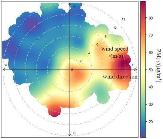 Wind direction determines the direction of migration and horizontal diffusion of atmospheric pollutants. The relationship between wind direction, wind speed, and PM2.5 is shown in Figure 5. Taiyuan is located in north-central China, with northerly and northwesterly winds prevailing. In the north and west of Taiyuan, there are a large number of factories, such as steel mills and power plants. When northerly wind prevails in Taiyuan, a large number of pollutants are transported from north to south, aggravating the urban pollution. According to Figure 5, when the wind direction is westerly or northerly, PM2.5 concentration is relatively high. A higher wind level facilitates PM2.5 migration, which leads to more pollution downwind.