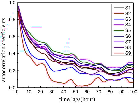 The autocorrelation coefficients of all stations when the value of the time lag k is different are shown in Figure 6. As seen, in general, the autocorrelation coefficients of all stations declined. When the time lag was smaller, the autocorrelation coefficient was larger. This indicates that a PM2.5 concentration closer to the current time has a stronger correlation with the PM2.5 concentration at the current time. The PM2.5 concentrations within a lag of 15 h are strongly correlated to each other in a period of one day. It is worth noting that, when the time lag was 24, 48, and 72 h, the autocorrelation coefficients of each station in Figure 6 showed a temporary rise. This is very likely due to the periodic living pattern across different days in the same geographical environment and season. As PM2.5 tends to stay in the air for a long time, its concentrations in the past few hours will affect observed data in the future. In addition to PM2.5 concentration, the past weather conditions, such as wind and rain/snow, also affect PM2.5 concentration. According to the above analysis, the current state of observed PM2.5 concentration is closely related to that in the past states. These findings can help us choose a suitable time lag for multiscale predictors.