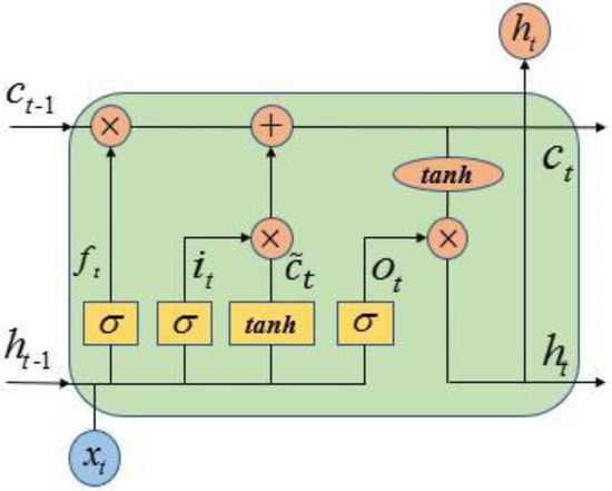 As a special kind of RNN, the LSTM network [10] is capable of learning long-term dependencies. It has the advantage of connecting previous information to the present task [23,24]. Because of its special memory cell architecture, the LSTM network overcomes the defects of the traditional RNN, especially the problems of gradient disappearance and gradient explosion. The architecture of an LSTM memory cell is shown in Figure 7, where each cell has three “gate” structures, namely, the input gate, the forget gate, and the output gate. A chain of repeating cells forms the LSTM layer. The calculation process of the spatiotemporal feature matrix in the LSTM layer is given in Equations (4)–(9).