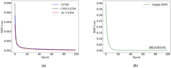 The loss convergence of deep learning methods in one-hour PM2.5 prediction: (a) loss convergence of LSTM, convolution neural network (CNN)–LSTM, and AC-LSTM models; (b) loss convergence of simple recurrent neural network (RNN) model.