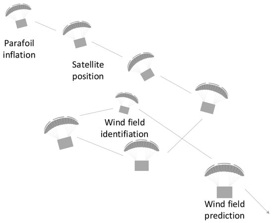 A parafoil system is a type of unmanned autonomous vehicle, which possesses the advantages of exceptional controllability and gliding performance, and can achieve fixed-point autonomous homing and soft landing compared with traditional parachute systems [,,,]. Parafoil systems play a significant role and have wide applications in the area of disaster assistance, aerospace, and military fields [,,,]. Due to their slow airspeed in comparison to conventional fixed-wing aircrafts, the parafoil systems are extremely susceptible to wind fields [,]. In particular, disturbed by both the speed and direction of the ambient wind field, the parafoil system easily deviates from its desired flight path and generates position drifts, even leading to a stall [,,]. Accurately obtaining the ambient wind field of the parafoil system can improve the performance of homing trajectory planning and controlling, which is a key to achieve precise autonomous homing of parafoil systems [,,].