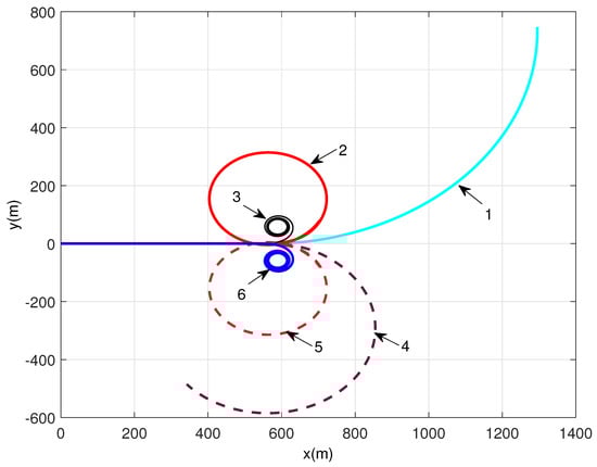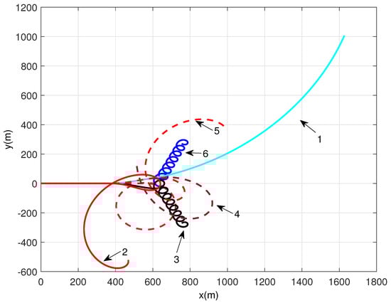 Figure 4 and Figure 5 show the flight trajectories of the parafoil system without and with winds, respectively (the numbers of trajectories are consistent with the numbers in Table 2). We observe that when the deflections on the parafoil are different, the corresponding trajectories are different. The greater the unilateral deflection is, the smaller the turning radius is and the faster the turning rate is, and vice versa. According to the comparison of trajectories between Figure 4 and Figure 5, the trajectories of the parafoil system drift due to the influence of wind fields. For example, the no.1 trajectory in Figure 4 drifts to the right when adding the lateral wind (2.0 m/s, 4.0 m/s) at 25 s (shown as the no.1 trajectory in Figure 5), and the drifting velocity and direction are related to the wind field.