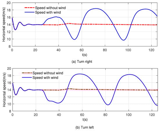 Speeds of the parafoil system before and after adding crosswind. (a) Turn right. (b) Turn left.
