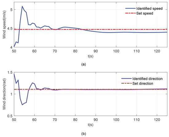 Furthermore, the same cross wind with the speed of 4.472 m/s and the direction of 1.1071 rad is added in the simulation environment, and 20% unilateral deflection is applied to the parafoil system. The wind field identification results are shown in Figure 8. The results show that after adding of deflection control, the wind field caused significant disturbances to the airspeed of the parafoil system in the early stage when the error of the wind field identification is large. As the flight state of the parafoil system gradually stabilizes, the identification result converges rapidly and enters a stable state after 90 s. The average wind speed identification error is 0.1 m/s, and the wind direction error is close to 0 rad, which indicates high identification accuracy.