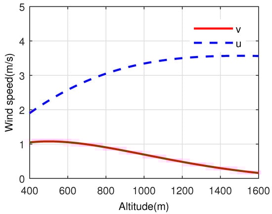 Substituting the identified wind field at a specific attitude into the atmospheric wind field prediction model, the lower average wind field can be predicted to provide a reference for real-time flight path optimization of parafoil systems. Since the meteorological data of the average wind fields at different altitudes are difficult to obtain, in order to facilitate the comparative analysis, this paper selects the measured instantaneous wind velocity of 36.0994° N, 114.9716° E, 12:00, 2 December 2013 (GMT+8) provided by Tianjin Weather Service []. The actual measurement wind velocity components are (u = 2.8361 m/s, v = −2.1750 m/s) at the altitude of 1744 m in the 14th layer. We use it instead of the average wind to calculate the geostrophic wind, and get = 2.6581 m/s. Substitute the results into the wind field prediction model, the average wind field at an altitude from 400 m to 1600 m is predicted, the results are as shown in Figure 9.