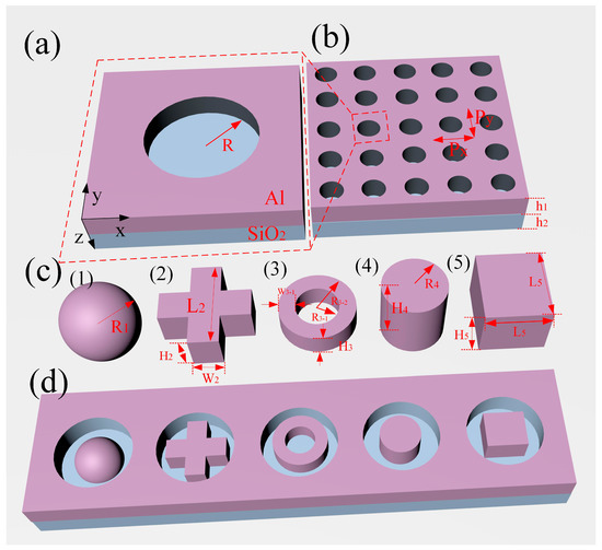 (a) Structural cross-sectional diagram of the unit structure in the X–Y plane. R represents the circle structure radius; h1 and h2 are the thickness of the Al and SiO2; Px and Py are the periods; as follows: R = 90 nm; h1 = 50 nm; h2 = 100 nm; Px = Py = 200 nm. (b) Cross-sectional diagrams of the periodic circle structure arrays. (c) Different nanoparticles: Sphere, Cross, Torus, Cylinder and Cube—they are all made of aluminum. (d) Schematic of the template structure filled with different nanoparticles.
