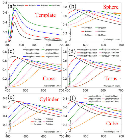Transmittances of the template and different nanoparticles. (a) Template; (b) Sphere; (c) Cross; (d) Torus; (e) Cylinder; (f) Cube.