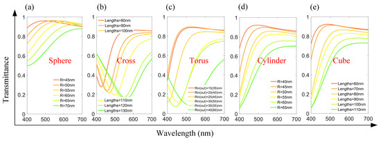 As shown in Figure 1c, we designed five kinds of nanoparticles: sphere, cross, torus, cylinder, and cube. In the simulations, we gave transmission spectrums for each type of nanoparticle, which had six different geometric parameters. The geometric parameters of the five nanoparticles were set as follows: (1) Sphere: the radii R1 of the sphere were 45 nm to 70 nm and the step was 5 nm. (2) Cross: the widths W2 of the rectangle of the cross remained unchanged at 20 nm, and we only changed the lengths of the rectangle. The lengths L2 were 80 nm to 130 nm, the step was 10 nm, and the nanoparticle thickness H2 was 50 nm. (3) Torus: the radii R3-1(3-2) of the torus were 15(35) to 40(60) nm, the step was 5 nm, and the nanoparticle thickness H3 was 50 nm. (4) Cylinder: the radii R4 of the cylinder were 40 nm to 65 nm, the step was 5 nm, and the nanoparticle thickness H4 was 50 nm. (5) Cube: the side lengths L5 of the cube were 60 nm to 110 nm, the step was 10 nm, and the nanoparticle thickness H5 was 50 nm. In order to understand more clearly how nanoparticles were filled into the template, the schematic diagram of the structures of five kinds of nanoparticles filled into the template is given in Figure 1d. As shown in Figure 2b–f, as the size of the metal nanoparticles increases, red-shift happens to the transmission peaks. Apparently, the positions of the transmission peaks, which cover the entire visible light regions, have played an extremely important role in constructing a coloring device for the surface plasmon’s structure from the six sets of simulation data.