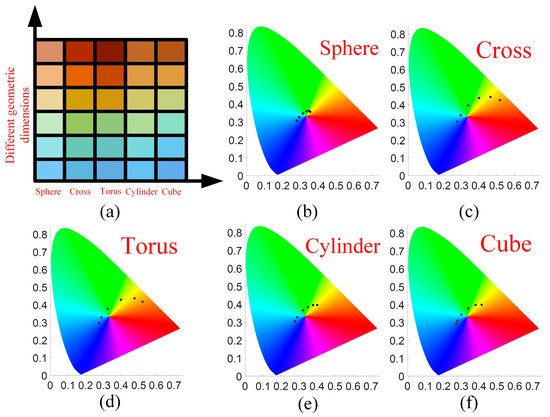(a) Color display of the different nanoparticles at different geometric parameters. (b–f) CIE1931 color space inversion map distribution under different conditions.